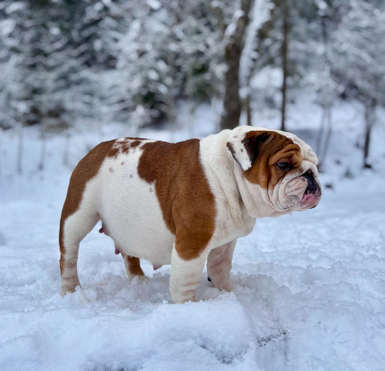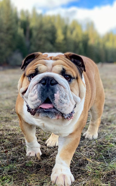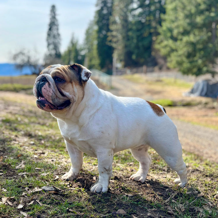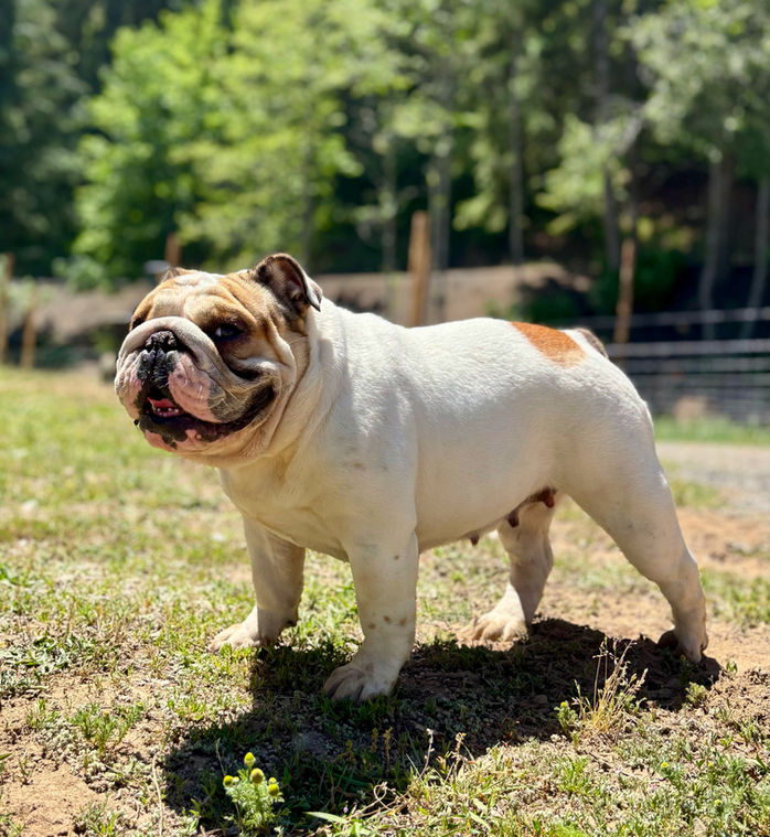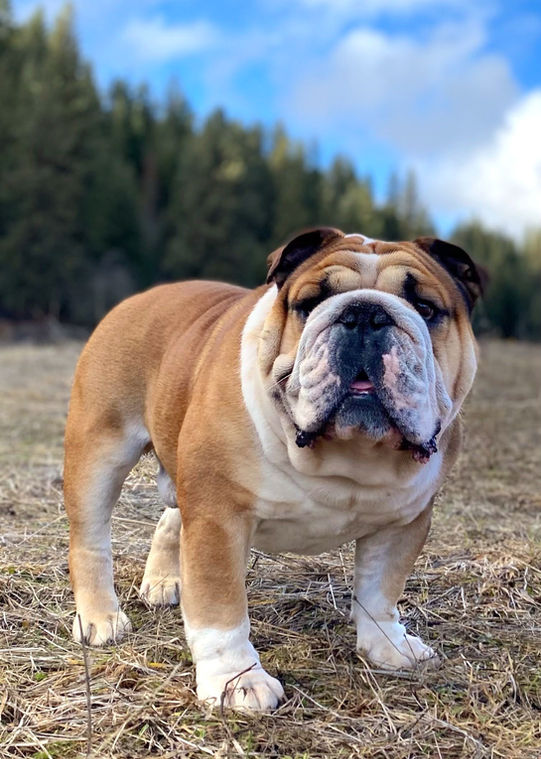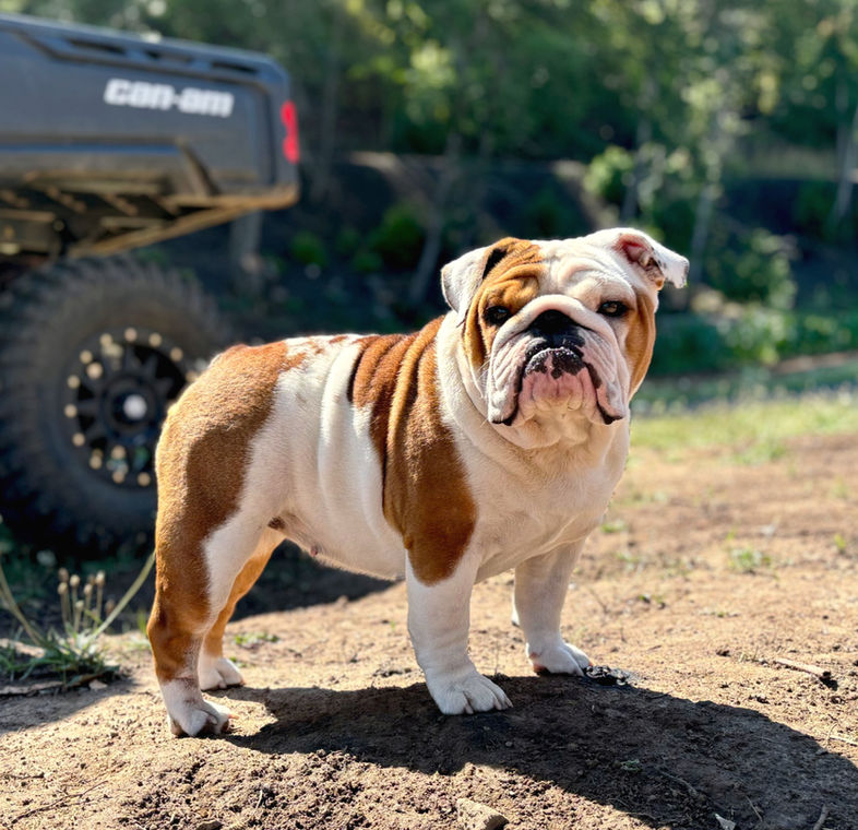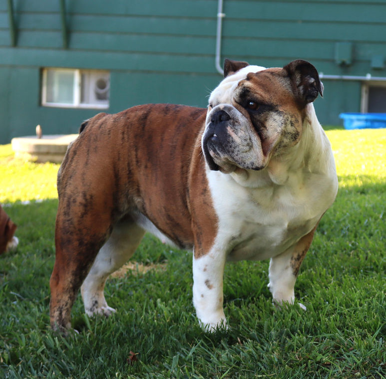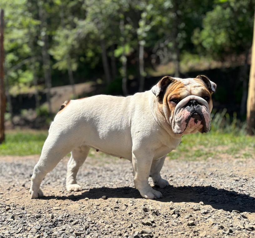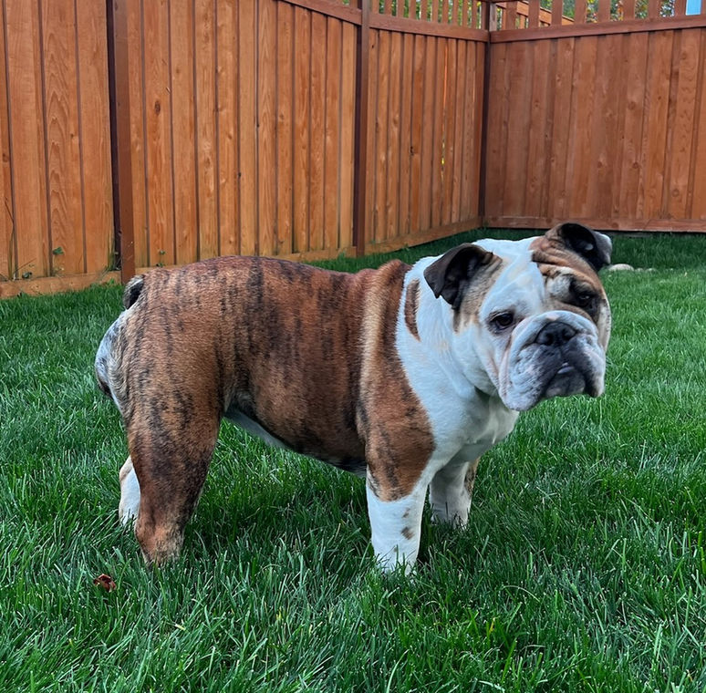 As a breeder, having a stunning, healthy, high quality stud is one of the most necessary and important parts of our life and what we do. Inde is just that. Bred by and co-owed with our good friends at Lake Valley Bulldogs, Inde is son of a Grand Champion and has the sought-after pedigree, large, beautiful head & frame, gorgeous coloring and sweet personality that we love to see in a quality standard English Bulldog. We are proud to pass down his outstanding health and qualities and display his name on the pedigree of any puppy we produce.