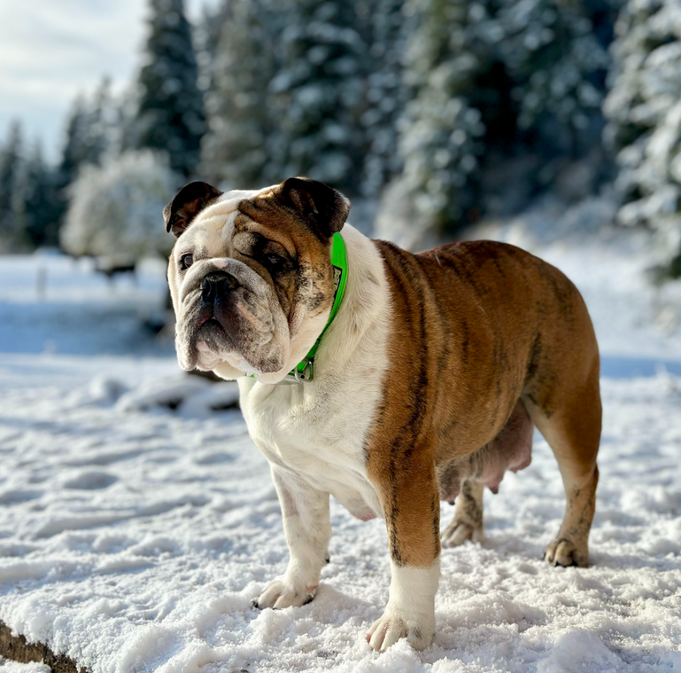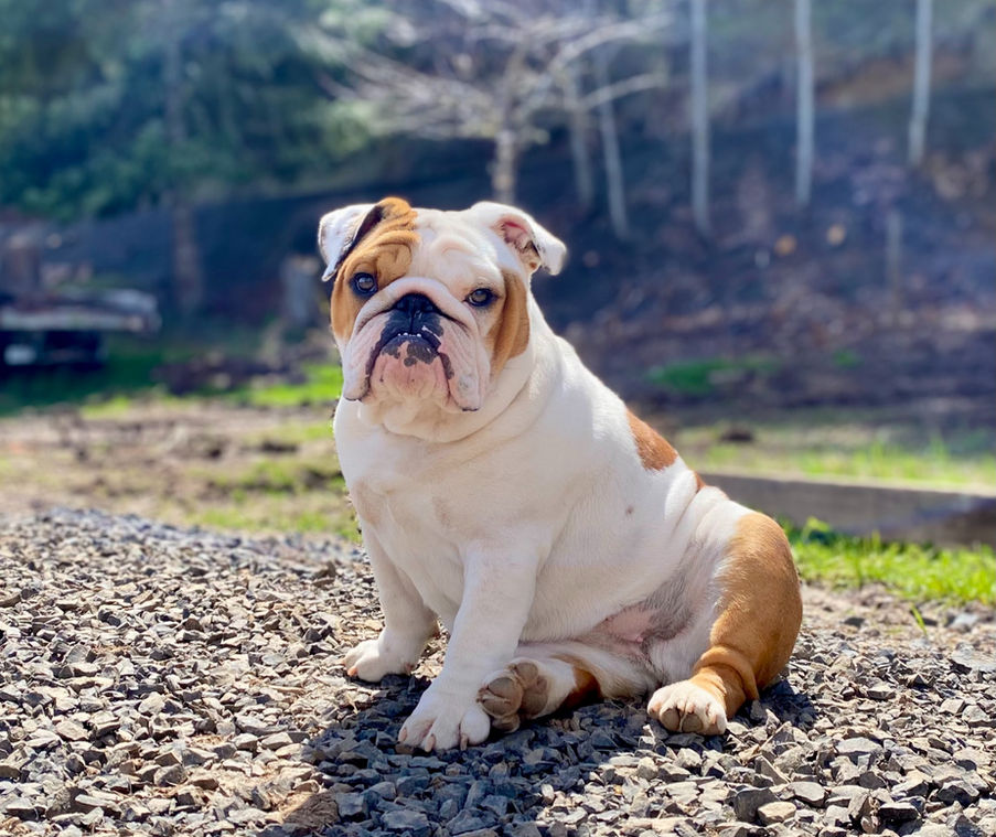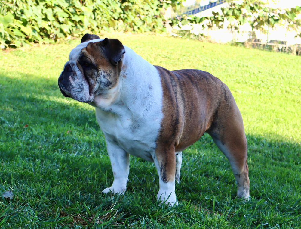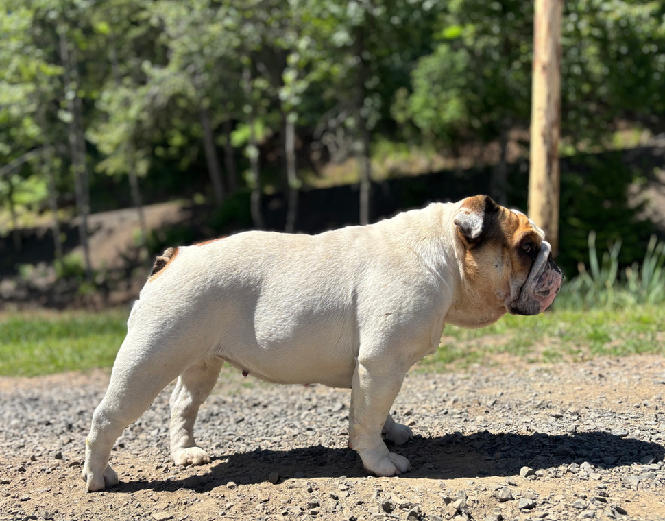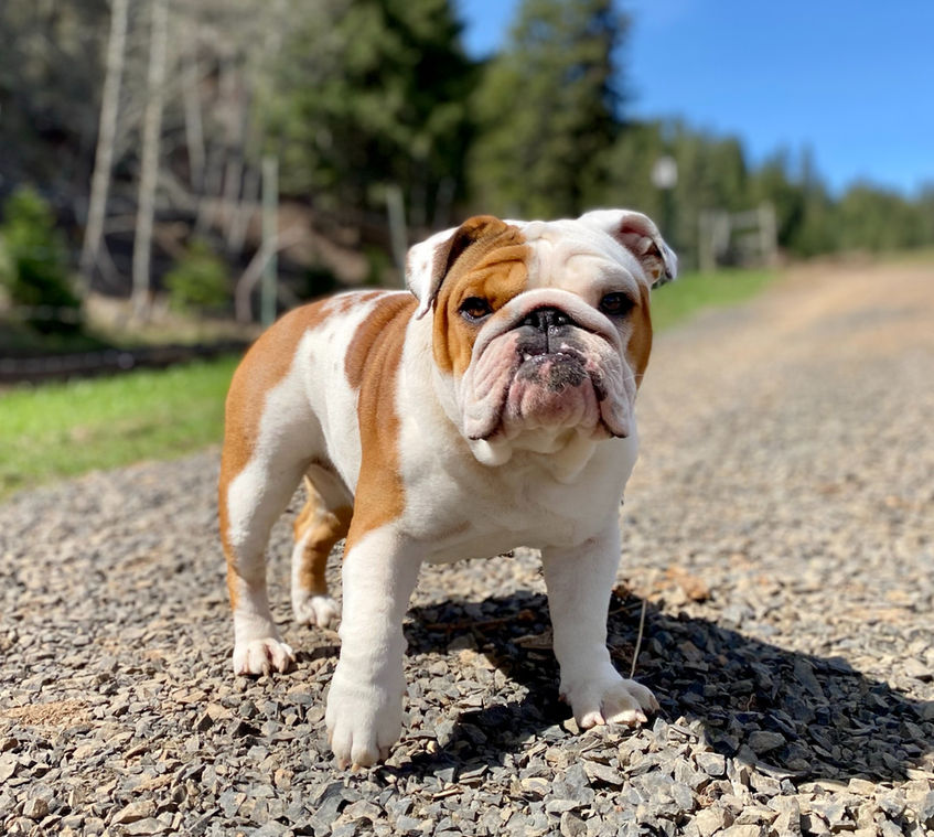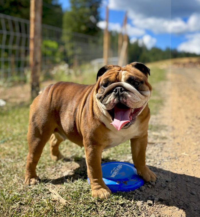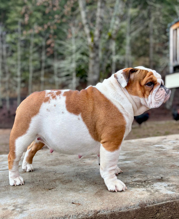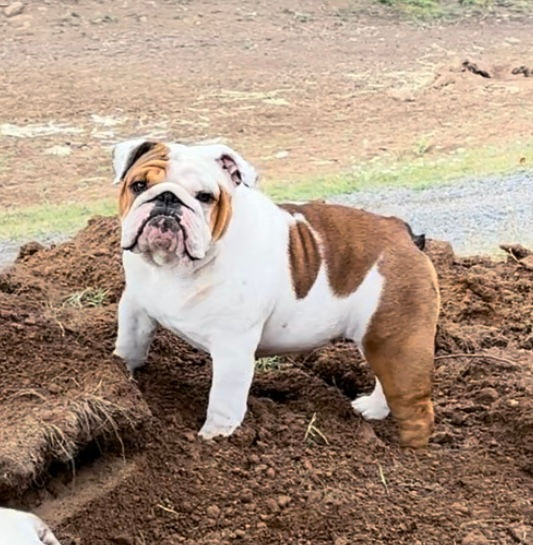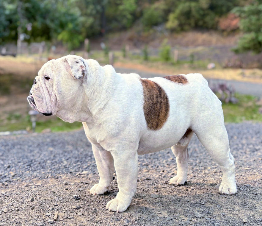 As a breeder, having a stunning, healthy, high quality stud is one of the most necessary and important parts of our life and what we do. Inde is just that. Bred by and co-owed with our good friends at Lake Valley Bulldogs, Inde is son of a Grand Champion and has the sought-after pedigree, large, beautiful head & frame, gorgeous coloring and sweet personality that we love to see in a quality standard English Bulldog. We are proud to pass down his outstanding health and qualities and display his name on the pedigree of any puppy we produce.