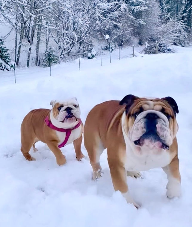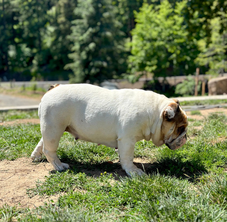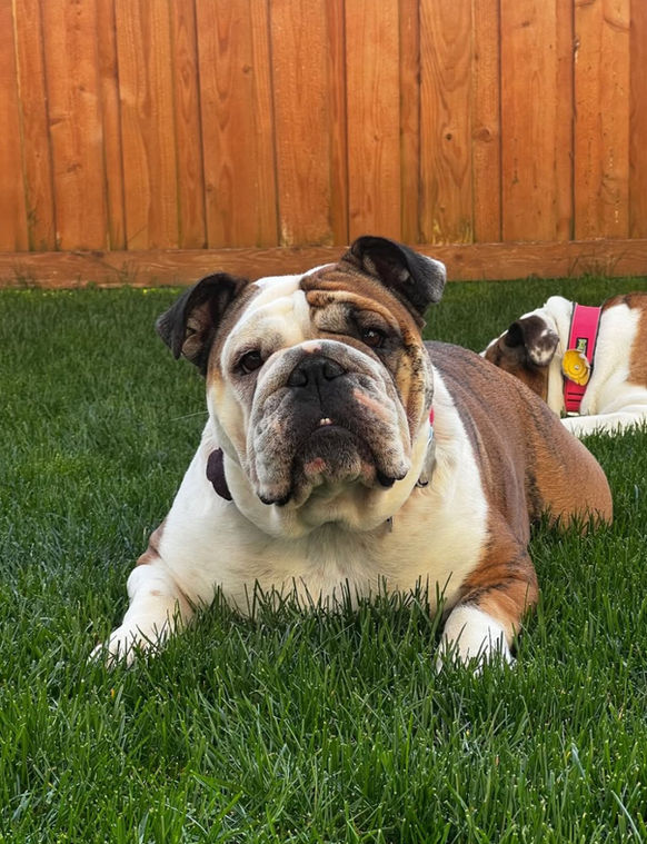 Jolly was our very first female and matriarch of our little bulldog family. Noel was her very first daughter and the first puppy we bred and raised from birth as our next generation mom. They both produced 4 healthy, beautiful litters and are now happily retired. We just couldn't bear to let our first girls go so they will live out their lives with us in our home, spoiled rotten and loved forever.