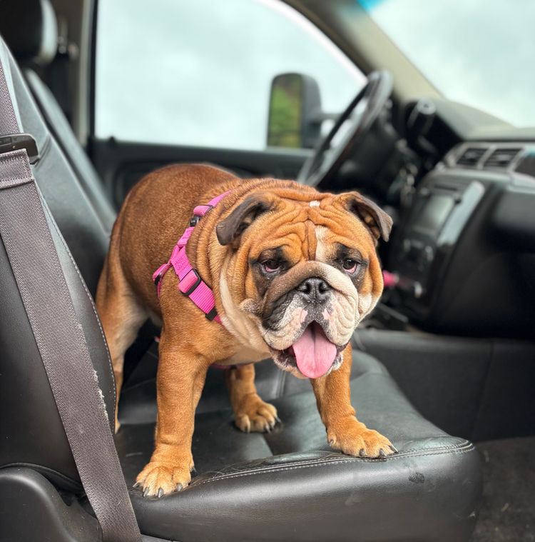 Introducing our beautiful little busy bee, Bizzy (formerly Skyview's Red Catalina Rose). She is our Lulu's sister; a tiny, compact little ball of energy & happiness, yet sweet & loving in her down time, coming to us from Macedo's by way of Skyview Bulldogs after both of these reputable breeders decided to take a step back from breeding for personal reasons. We were more than happy to welcome this beautiful girl into our family, because she IS family! Her mom is sister to Lulu's mama Mosey, and Dad is Lulu's dad Tiny Man, who is also a repeat baby daddy of ours. She's also cousins with all our girlsOf course we could not say no to this one joining our little clan!